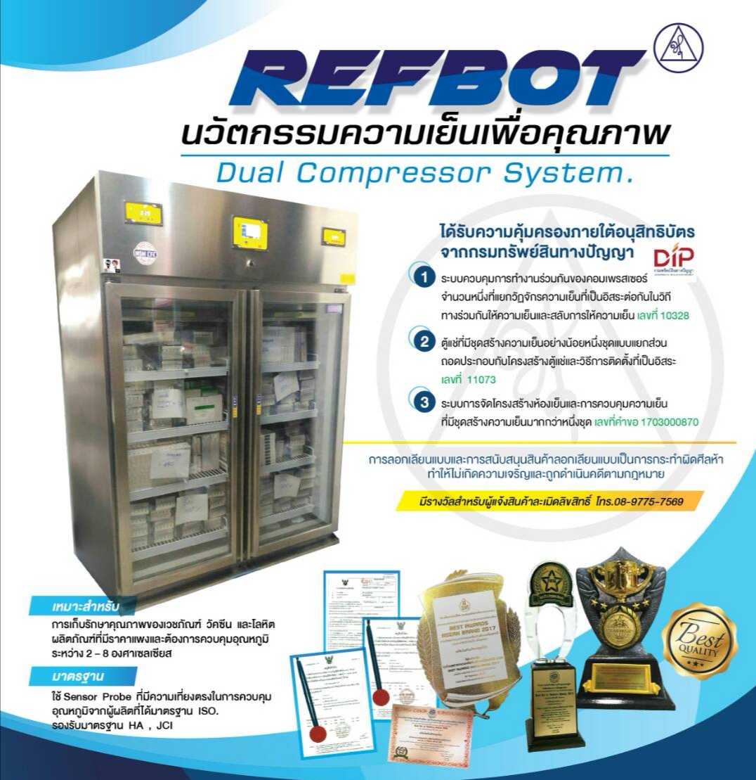 ตู้แช่ยา REFBOT ถูกผลิตขึ้นมาด้วยชุดควบคุมความเย็นอัจฉริยะสองชุดพร้อมด้วยชุดเก็บบันทึกข้อมูล แสดงเป็นกราฟที่หน้าจอมอนิเตอร์และบันทึกข้อมูลอัตโนมัติใช้ในการตรวจสอบอุณหภูมิของตู้เย็น สามารถนำผลมาออกมาปริ้นข้อมูลดูย้อนหลังได้